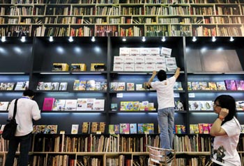 5月17日,參展單位工作人員在展架上整理漫畫書籍等參展品。當日,第六屆中國(深圳)國際文化產(chǎn)業(yè)博覽交易會落下帷幕。本屆文博會的總成交額已過千億元,超過上屆總成交額。新華社記者