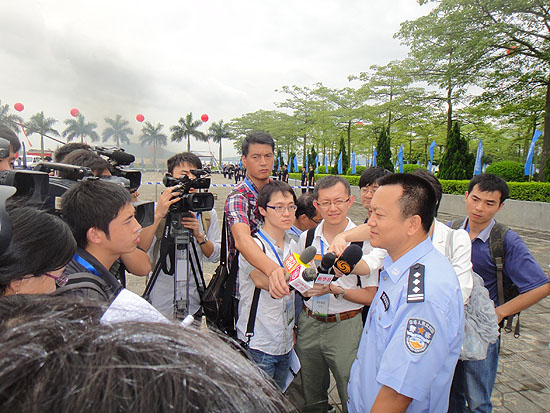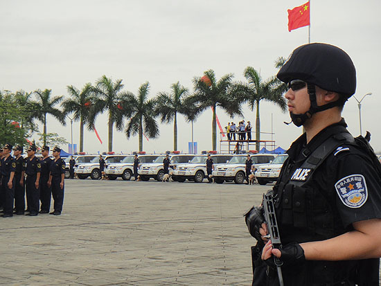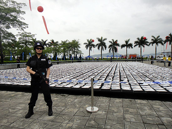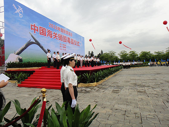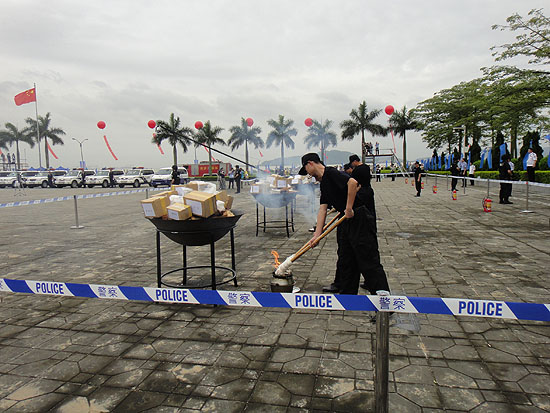 | 海關(guān)總署25日上午在廣東虎門舉行儀式,銷毀全國海關(guān)近年來查獲的上噸走私毒品。圖為現(xiàn)場四周警察嚴陣以待。 |