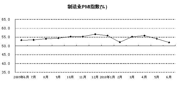 2010年6月,中國制造業(yè)采購經(jīng)理指數(shù)(PMI)為52.1%,低于上月1.8個(gè)百分點(diǎn),該指數(shù)已連續(xù)兩個(gè)月出現(xiàn)回落,但仍位于臨界點(diǎn)——50%以上。表明制造業(yè)經(jīng)濟(jì)總體繼續(xù)保持增長態(tài)勢,但在國家近期出臺的宏觀經(jīng)濟(jì)政策以及世界經(jīng)濟(jì)復(fù)蘇步伐放慢等因素作用下,增速趨緩。