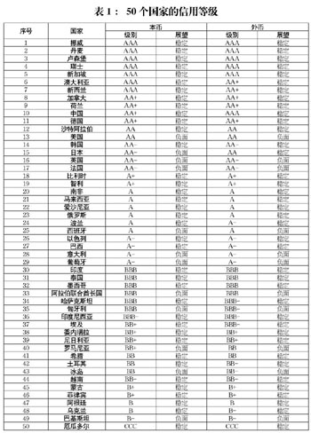 全球金融危機的爆發(fā)進(jìn)一步加劇了國際信用體系的矛盾,使全球信用鏈條中最基本最重要的環(huán)節(jié)——國家信用出現(xiàn)危機。國家信用危機使世界經(jīng)濟(jì)和人類社會安全面臨歷史性的挑戰(zhàn)。作為以揭示信用風(fēng)險,向世界提供公正信用評級資訊為己任的專業(yè)信用評級機構(gòu),大公國際資信評估有限公司將第一批五十個國家的信用評級結(jié)果公之于世,有益于世界對國家信用這一最為復(fù)雜的信用關(guān)系的風(fēng)險態(tài)勢作出科學(xué)判斷,制定應(yīng)對措施。大公首次選擇的五十個國家分布于全球各洲,其國內(nèi)生產(chǎn)總值合計占到世界經(jīng)濟(jì)總量的百分之九十,具備各區(qū)域信用風(fēng)險的典型特征,代表了國家信用風(fēng)險在世界范圍的布局及變化情況。 大公對國家信用風(fēng)險的評價結(jié)果是依據(jù)大公創(chuàng)建的新型國家信用評級標(biāo)準(zhǔn)得出的,基本體現(xiàn)了國家信用風(fēng)險要素的內(nèi)在聯(lián)系和信用評級的原則,使信用等級客觀反映了這些國家的實際債務(wù)償還能力,現(xiàn)將大公對五十個國家的首次信用等級評定結(jié)果公布如下: