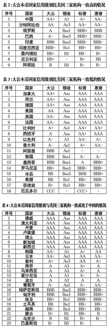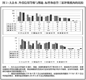 為了具體解釋大公給出各國信用級別的依據(jù),從中體現(xiàn)大公評級方法的核心分析理念,證明大公評級結(jié)論的科學(xué)性,本部分從兩個方面采取比較分析的方法闡釋。一方面是將大公在不同級別上的國家基本評級特征加以比較,從而反映出各級別風(fēng)險程度的差異;另一方面是將大公的級別與美國三家機構(gòu)——穆迪、標(biāo)普和惠譽的評級結(jié)果進(jìn)行比較分析,反映在不同評級理念指導(dǎo)下,大公與上述美國三家機構(gòu)對具體國家償債能力在判斷上的差異。 (一)大公國家信用等級的比較分析 本部分選取本幣AAA、AA和A三個等級的國家作為分析對象,闡釋它們在國家信用風(fēng)險水平方面的差異。 1、本幣AAA級國家 本幣AAA國家包括挪威、澳大利亞、丹麥、盧森堡、瑞士、新加坡、新西蘭。AAA級國家在每一個核心要素上都表現(xiàn)出非常強大的實力,沒有一個方面存在明顯缺陷,可以保障在任何可預(yù)見的情況下都無損其償債能力。主要特征為:①政治體制成熟,運轉(zhuǎn)良好,國家發(fā)展戰(zhàn)略清晰,執(zhí)行有力,效果明顯,國家安全局勢穩(wěn)定;②經(jīng)濟(jì)實力強,在全球具有競爭優(yōu)勢,隨著世界經(jīng)濟(jì)的復(fù)蘇,增長前景較有保障;③金融體系發(fā)達(dá)且抗沖擊能力強;④政府能夠長期保持穩(wěn)健的財政記錄,雖受到金融危機影響政府赤字和債務(wù)上升,但是不損害財政收入的可持續(xù)性,貨幣對內(nèi)價值穩(wěn)定;⑤債務(wù)以本幣計值為主,或外部流動性良好,外儲充裕,貨幣對外價值穩(wěn)定。 2、本幣AA級國家 本幣AA級國家主要有:中國、加拿大、荷蘭、德國、美國、沙特阿拉伯、法國、英國、韓國、日本。AA級國家大都在五個核心評級要素中至少有三到四個要素保持非常強大的實力,但是在其他一到兩個要素上則存在一定的缺陷,使其償債能力的抗風(fēng)險性與AAA級相比有所下降。 上述AA級國家從風(fēng)險特征上大致可以分為兩類,一類集中在處于國際金融危機中心的歐美發(fā)達(dá)國家,在金融危機沉重打擊下,加之核心要素上本來已經(jīng)存在的一些缺陷,財政出現(xiàn)了明顯惡化。包括:德國、美國、英國、法國、荷蘭、加拿大和日本,這些國家存在程度不等的財政壓力,但綜合體制實力的優(yōu)勢有助于它們贏得財政和債務(wù)的調(diào)整空間。 另一類國家財政可持續(xù)性強,經(jīng)濟(jì)前景更樂觀,但面臨經(jīng)濟(jì)結(jié)構(gòu)調(diào)整或者地緣政治風(fēng)險方面的現(xiàn)實問題,與AAA級國家的抗風(fēng)險能力還存在一定差距。包括:中國、沙特阿拉伯阿拉伯和韓國。 3、本幣A級國家 本幣A級國家有:比利時、智利、西班牙、南非、馬來西亞、愛沙尼亞、俄羅斯、波蘭、以色列、意大利、葡萄牙和巴西。 A級別國家往往僅在兩、三個評級要素上具有強大的實力,而其具有的缺陷比AA級國家更為明顯,從而總體償債能力進(jìn)一步下降。 A級別國家在要素特征上也大致呈現(xiàn)出兩種類型,一類是綜合體制實力下降、財政狀況面臨嚴(yán)峻挑戰(zhàn)的發(fā)達(dá)經(jīng)濟(jì)體;另一類是經(jīng)濟(jì)蓬勃發(fā)展,但存在一些不穩(wěn)定性的新興經(jīng)濟(jì)體。 在這一等級中,西班牙、葡萄牙、意大利等發(fā)達(dá)經(jīng)濟(jì)體綜合體制實力的下降已嚴(yán)重制約了經(jīng)濟(jì)增長潛力和增長前景,同時它們的債務(wù)或財政赤字問題較為突出,如果經(jīng)濟(jì)增長或財政收入增長的速度仍落后于債務(wù)的增長速度,一次程度較大的突發(fā)性外部或內(nèi)部沖擊會使融資及債務(wù)償還面臨較大風(fēng)險;而對于智利、俄羅斯、波蘭、巴西等新興經(jīng)濟(jì)體,它們致力于經(jīng)濟(jì)結(jié)構(gòu)改革,經(jīng)濟(jì)快速增長,經(jīng)濟(jì)規(guī)模不斷擴大,財政狀況也較為理想,但是經(jīng)濟(jì)結(jié)構(gòu)仍存在一定問題,抗沖擊能力及增長的穩(wěn)定性有待進(jìn)一步增強。 (二)與穆迪、標(biāo)普、惠譽三家評級機構(gòu)的比較分析 從大級別(不考慮+/-號的差異)的評定來看,大公與穆迪、標(biāo)普、惠譽三家評級機構(gòu)的差異比較顯著,而這三家機構(gòu)之間的信用等級差異較小,見圖2。 以本幣信用級別為例,大公的級別一致高于美國三家機構(gòu)級別的情況出現(xiàn)了9次,一致低于其他機構(gòu)的情況為18次,完全相同或處于其他機構(gòu)的級別之間的情況為23次(為方便比較,本報告中使用如下幾個關(guān)鍵詞代表級別比較結(jié)論:“一致高”意味著大公給定的級別一致高于美國三家機構(gòu)的級別;“一致低”意味著大公給定的級別一致低于美國三家機構(gòu)的級別)。 大公給予表2中國家高于美國三家機構(gòu)的信用等級,主要是基于大公的評級理念和方法,認(rèn)為上述國家的國家管理能力不斷改善,經(jīng)濟(jì)增長潛力長期穩(wěn)定,財政穩(wěn)健性和抗擊外部沖擊的能力日益增強等。特別是發(fā)生全球金融危機后,上述國家的表現(xiàn)證明他們更有可能在較短時間內(nèi)化不利為有利,保障國家信用水平的提高。 大公所給級別一致低于其他機構(gòu)的國家以發(fā)達(dá)國家為主,共13個,占總數(shù)的68%(見表3),反映了大公對全球金融危機的沉重打擊下,這些國家信用能力的審慎看法。大公的評級方法強調(