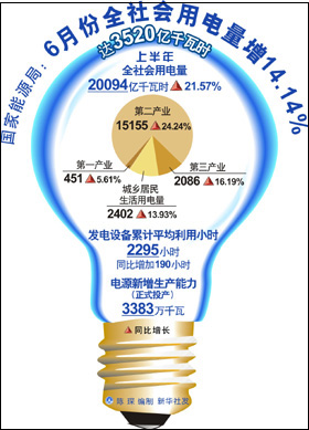 6月份,全社會用電量3520億千瓦時,同比增長14.14%,增速比5月份下降6.66個百分點,環(huán)比增長1.1%。1至6月,全社會用電量20094億千瓦時,同比增長21.57%。從分類用電量看,第一產(chǎn)業(yè)451億千瓦時,增長5.61%;第二產(chǎn)業(yè)15155億千瓦時,增長24.24%;第三產(chǎn)業(yè)2086億千瓦時,增長16.19%;城鄉(xiāng)居民生活用電2402億千瓦時,增長13.93%。 記者注意到,單月同比增長14.14%是今年各月同比增速中最緩的,今年前5個月已經(jīng)連續(xù)維持了20%以上的同比增速。 國家電網(wǎng)能源研究院副院長胡兆光表示,從6月的用電量增速減緩看來,我國經(jīng)濟正在做一個理性的回歸,“之前連續(xù)數(shù)月20%以上的增速在歷史上是罕見的,去年上半年的基數(shù)較低是主要原因,在中央一攬子計劃刺激下,2009年6月用電量同比增速正式轉(zhuǎn)正,所以會造成今年用電量增速前高后低的情況,”胡兆光告訴《經(jīng)濟參考報》記者。 6月全社會用電量的同比增速是14.14%,胡兆光認為到今年底還會繼續(xù)釋放回歸,增速還會往下走!叭绻搅四甑状蠹野l(fā)現(xiàn)用電量月度增幅在2%至6%之間,也不要覺得奇怪和可怕,政府在金融危機期間做了一些大的手段調(diào)控使得用電量出現(xiàn)了較大的波幅,往后的增幅逐步減小正好表明了中國經(jīng)濟逐步趨穩(wěn)。”胡兆光說。 國家倡導并嚴格執(zhí)行的節(jié)能減排政策被眾多專家認為是包括眾多高耗能行業(yè)在內(nèi)的重工業(yè)用電量增速環(huán)比下降較多的一個重要原因。 華北電力大學校長助理張粒子教授告訴《經(jīng)濟參考報》記者,“前一陣國家嚴格執(zhí)行對高耗能企業(yè)的差別電價政策對重工業(yè)的用電量有一定影響,政府對一些高耗能產(chǎn)業(yè)的宏觀調(diào)控手段初見成效”。 中投顧問能源行業(yè)首席研究員姜謙認為,目前是實現(xiàn)“十一五”期間單位GDP能耗下降20%目標的關(guān)鍵時期,各部委相繼出臺多項舉措,對鋼鐵、有色、電力、建材、石化等重點行業(yè),采用取消優(yōu)惠電價、執(zhí)行差別電價、加大對高耗能企業(yè)關(guān)停力度等多種手段加以抑制。“此外,寧夏、四川、浙江等多個省區(qū)自6月1日起相繼取消對高耗能行業(yè)的優(yōu)惠電價,由此必然導致區(qū)內(nèi)高耗能企業(yè)減少用電量。這也是6月份全國重工業(yè)用電量同比增速大幅回落的重要因素。”姜謙告訴《經(jīng)濟參考報》記者。 電監(jiān)會研究室的吳疆研究員提醒《經(jīng)濟參考報》記者,不要光看重工業(yè)的用電量增速減緩這一個數(shù)據(jù),“重工業(yè)用電量絕對量和占全社會用電量比例的環(huán)比下降,更可以說明一些問題! 記者比較了5月份的《全國電力工業(yè)統(tǒng)計數(shù)據(jù)》,在6月份全國全社會用電量、第一產(chǎn)業(yè)、輕工業(yè)、第三產(chǎn)業(yè)、城鄉(xiāng)居民生活全面較5月份正增長的情況下,6月的重工業(yè)用電量絕對量環(huán)比下降17億千瓦時,占全社會用電量比例環(huán)比下降1.22%。