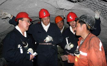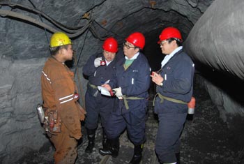 雞西分公司總經(jīng)理孫若山(左二)在井下考問工人安全生產(chǎn)知識(shí)。(資料照片) |