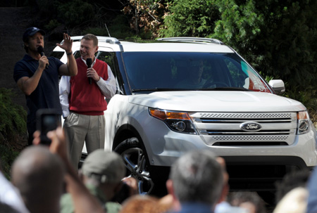 7月26日,美國(guó)福特汽車公司總裁兼首席執(zhí)行官艾倫·穆拉利(上右)出席在紐約曼哈頓舉行的2011款福特Explorer展示活動(dòng)。當(dāng)日,福特公司在紐約舉行2011款福特Explorer揭幕展示活動(dòng)。2011款福特Explorer誕生于福特全新車型平臺(tái),號(hào)稱擁有更輕的體重、更高效的發(fā)動(dòng)機(jī)以及世界首創(chuàng)的安全技術(shù)。