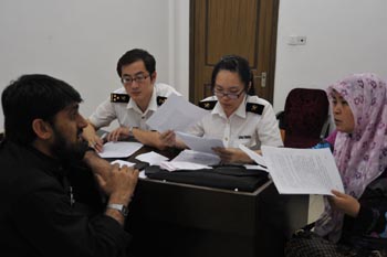 圖為海關(guān)關(guān)員通過(guò)翻譯向販假外商了解其知假販假情況。 |