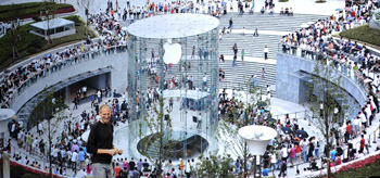 9月1日,在美國(guó)加州舊金山舉行的新產(chǎn)品發(fā)布會(huì)上,蘋(píng)果公司首席執(zhí)行官喬布斯(左下)介紹位于中國(guó)上海的蘋(píng)果產(chǎn)品零售店。當(dāng)日,蘋(píng)果公司發(fā)布新一代iPod、AppleTv等產(chǎn)品。新華社記者 戚恒/攝 |