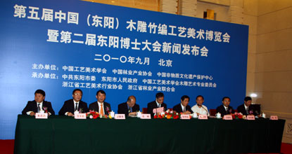 9月8日,由中國工藝美術(shù)學(xué)會、中國林業(yè)產(chǎn)業(yè)協(xié)會和中國非物質(zhì)文化遺產(chǎn)保護(hù)中心共同主辦,中共東陽市委、東陽市人民政府、中國工藝美術(shù)學(xué)會木雕藝術(shù)專業(yè)委員會、浙江省工藝美術(shù)行業(yè)協(xié)會、浙江省林業(yè)產(chǎn)業(yè)聯(lián)合會承辦的《第五屆中國(東陽)木雕竹編工藝美術(shù)博覽會暨第二屆東陽博士大會》新聞發(fā)布會在人民大會堂浙江廳舉行。東陽市領(lǐng)導(dǎo)及在京相關(guān)單位的主要負(fù)責(zé)人出席了此次活動。