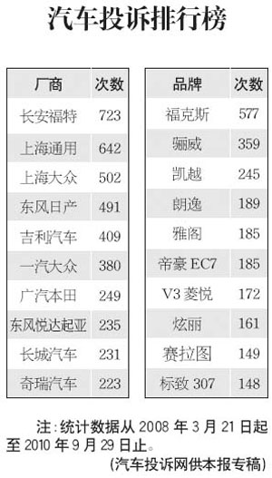 長(zhǎng)安福特高居汽車(chē)投訴排行榜榜首