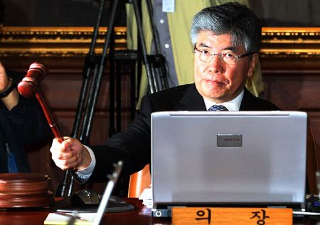 10月14日,在位于韓國首爾的韓國央行——韓國銀行內(nèi),韓國央行行長金仲秀在主持例會。 當(dāng)日,韓國中央銀行——韓國銀行召開金融貨幣委員會例會,宣布將基準(zhǔn)利率保持在目前的2.25%水平不變。這是韓國央行連續(xù)三個月維持基準(zhǔn)利率不變。有分析人士指出,韓國央行行長金仲秀在8月凍結(jié)利率后曾多次強調(diào)要穩(wěn)定物價并恢復(fù)利率正;虼,央行做出維持基準(zhǔn)利率的決定可能會錯失加息良機。