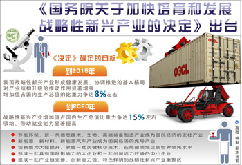 10月18日,《國(guó)務(wù)院關(guān)于加快培育和發(fā)展戰(zhàn)略性新興產(chǎn)業(yè)的決定》指出,根據(jù)戰(zhàn)略性新興產(chǎn)業(yè)的特征,立足我國(guó)國(guó)情和科技、產(chǎn)業(yè)基礎(chǔ),現(xiàn)階段將重點(diǎn)培育和發(fā)展節(jié)能環(huán)保、新一代信息技術(shù)、生物、高端裝備制造、新能源、新材料、新能源汽車等產(chǎn)業(yè)。到2015年,七大戰(zhàn)略性新興產(chǎn)業(yè)的增加值占中國(guó)GDP的比重將提高到8%,到2020年將升至15%。