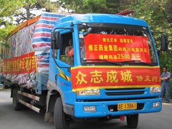 2008年5月15日,吉林修正藥業(yè)向四川地震災區(qū)捐贈的價值2500萬元的藥品,將通過吉林紅十字會運往四川。資料照片 |