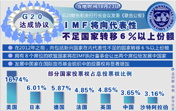 本屆G20財(cái)長和央行行長會議就發(fā)展中國家提升在IMF中的地位達(dá)成里程碑式協(xié)議。協(xié)議同意歐盟將向發(fā)展中國家轉(zhuǎn)讓2個席位和6%以上的投票權(quán),IMF董事會目前共有24個席位。該組織執(zhí)行主席卡恩稱此舉為“歷史性”時刻。
