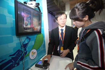 手機(jī)支付已成為新的競爭熱點(diǎn),圖為在10月份舉辦的中國國際通信展上某工作人員向觀眾展示其手機(jī)支付業(yè)務(wù)。新華社記者 陳曉根/攝 |