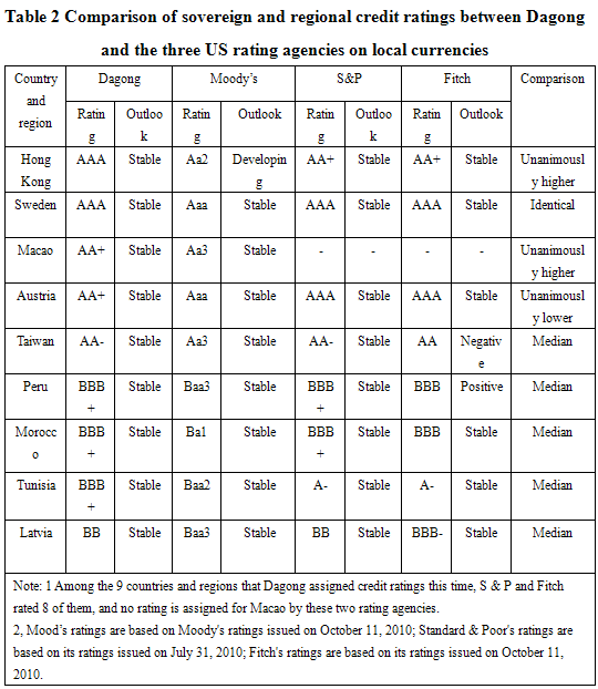 Take the credit rating on local currency as an example, there are two occurrences that Dagong’s rating results are unanimously higher than those of the three rating agencies.  They are Hong Kong and Macao. There is one occurrence that Dagong’s rating result is unanimously lower than that of the three rating agencies and it is Austria. There are six occurrences that Dagong’s rating results are either identical with or between those of the three rating agencies, and they are Sweden, Taiwan, Peru, Morocco, Tunisia and Latvia. The rating details are summarized in table 2.
