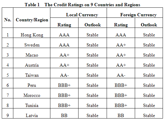 To introduce the rating grades of the local currency of the 9 countries and regions, our discussion centers around the following two respects: firstly we will compare the credit risk difference of the 9 countries and regions with different scales; secondly we will compare our results with the credit ratings given by the three American credit rating agencies, namely Moody’s, Standard & Poor and Fitch.