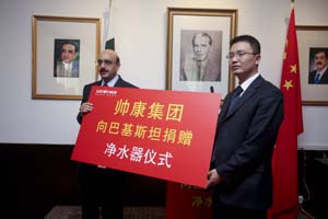 圖為帥康集團(tuán)凈水器事業(yè)部總經(jīng)理周寵(右)向巴基斯坦駐華大使馬蘇德·汗(左)捐贈凈水器。資料照片 |