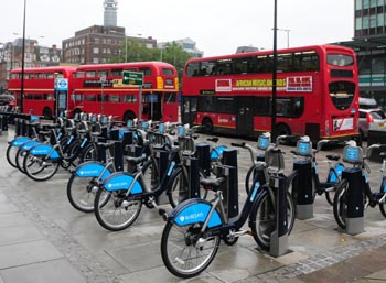 10月2日,在英國首都倫敦,絡(luò)繹不絕的公交車駛過一個(gè)自行車租賃站。 |