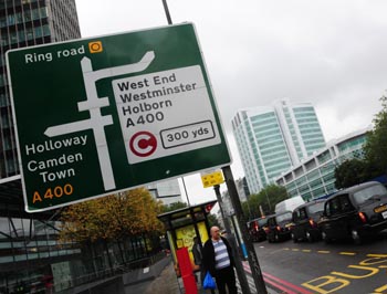 倫敦中心區(qū)劃有一個(gè)巨大橢圓形區(qū)域?yàn)閾矶聟^(qū),周一至周五從上午7時(shí)到晚上6時(shí)進(jìn)入該區(qū)域需繳納擁堵費(fèi)。從距離該區(qū)域的幾英里遠(yuǎn)的地方就不斷出現(xiàn)醒目的大紅色“C”字提示標(biāo)志,告訴你距離收費(fèi)區(qū)還有多遠(yuǎn),不需進(jìn)入收費(fèi)區(qū)的車輛可以及早改道。接近收費(fèi)區(qū)時(shí)顯示有醒目的紅色“C”字標(biāo)志頻繁出現(xiàn),不必進(jìn)入該區(qū)域的車輛仍有機(jī)會(huì)改道行駛。越過地面標(biāo)有紅色“C”字標(biāo)志即進(jìn)入擁堵區(qū),你的車輛將被自動(dòng)拍下車輛牌號(hào),你必須盡快繳納“擁堵費(fèi)”。當(dāng)天繳納費(fèi)用為每輛車每天8英鎊,交費(fèi)一次當(dāng)天即可多次出入。如果第二天繳納即需付10英鎊。因此,對(duì)許多倫敦居民來說,在開車時(shí)必須注意前方是否有標(biāo)注字母C的收費(fèi)區(qū),一旦越過界線,便須交納“交通擁堵費(fèi)”。