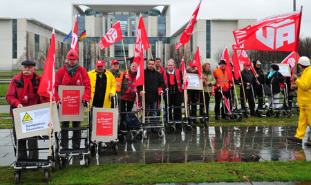 圖為德國工會組織IG-Metall的成員17日在柏林總理府前舉行示威活動,抗議政府的財(cái)政緊縮措施。作為財(cái)政緊縮政策的一部分,德國勞工部長馮德萊恩當(dāng)天宣布,將退休年齡從65歲提高至67歲。由于出生率下降、人口老化,加上金融危機(jī)暴露歐洲各國的財(cái)政赤字問題,歐洲各國在出臺財(cái)政緊縮措施時(shí)都將削減退休金成本作為重要內(nèi)容,推遲退休已成趨勢。此前,法國政府的退休制度改革也引發(fā)了曠日持久的罷工潮。