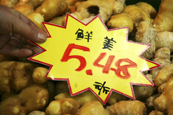 山東省臨沂市郯城縣一家超市的員工將當(dāng)日的價格牌放在生姜上。 據(jù)新華社全國農(nóng)副產(chǎn)品和農(nóng)資價格行情系統(tǒng)監(jiān)測數(shù)據(jù)顯示,11月9日以來,全國生姜價格降勢明顯,截至11月22日累計(jì)降幅為2.8%。新華社發(fā)(張春雷