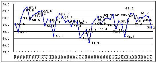 2010年11月,中國(guó)物流與采購(gòu)聯(lián)合會(huì)(CFLP)發(fā)布的中國(guó)非制造業(yè)商務(wù)活動(dòng)指數(shù)為53.2%,比上月回落7.3個(gè)百分點(diǎn)。由于非制造業(yè)沒(méi)有綜合指數(shù),通常以商務(wù)活動(dòng)狀況指數(shù)來(lái)反映非制造業(yè)經(jīng)濟(jì)的總體變化。本月中國(guó)非制造業(yè)PMI各單項(xiàng)指數(shù)中,中間投入價(jià)格指數(shù)、收費(fèi)價(jià)格指數(shù)和業(yè)務(wù)活動(dòng)預(yù)期指數(shù)出現(xiàn)回升,其余主要指數(shù)則呈現(xiàn)不同程度回落。