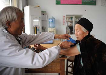 11月29日,一名山東省鄒平縣廉家村農(nóng)民在衛(wèi)生室體檢時檢測血壓。2010年11月開始,山東省鄒平縣為全縣62萬農(nóng)民進(jìn)行當(dāng)年的第二次體檢工作全面展開。記者 徐速繪/攝 |