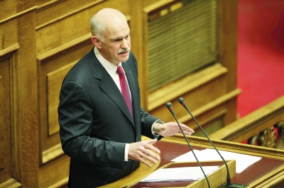 希臘議會23日通過2011財政年度預(yù)算案,打算以削減公共支出、增稅等方式削減50億歐元財政赤字,把財政赤字占國內(nèi)生產(chǎn)總值的比例從今年的9.4%降至7.4%,以達(dá)到今年5月接受金融援助時設(shè)立的指標(biāo)。此舉引發(fā)反對黨和民眾不滿,不少民眾聚集在議會大樓前進(jìn)行了和平示威。圖為希臘總理喬治?帕潘德里歐在議會就預(yù)算問題發(fā)言。