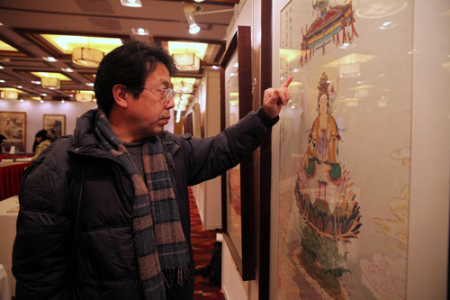 2010年12月27日,一位客戶在觀看夏荊山的佛教繪畫作品。當(dāng)日,歷代名畫記“年終客戶答謝暨2011年復(fù)制書畫禮品推介展”在北京國際飯店會議中心舉行。