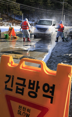 1月5日,工作人員在進入韓國江原道襄陽地區(qū)最大規(guī)模的養(yǎng)豬場的路上進行消毒防疫,該養(yǎng)豬場內(nèi)曾確認口蹄疫暴發(fā)。 農(nóng)林水產(chǎn)食品部和地方政府官員確認,4日新增4例口蹄疫病例,使去年11月29日疫情暴發(fā)以來確診病例總數(shù)增至85例。