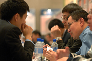 一名留學(xué)德國(guó)的創(chuàng)業(yè)項(xiàng)目負(fù)責(zé)人(右)在洽談會(huì)現(xiàn)場(chǎng)向國(guó)內(nèi)一家企業(yè)代表推介帶來(lái)的芯片開(kāi)發(fā)技術(shù)項(xiàng)目。 新華社記者 黃宗治