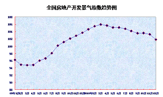 12月份,全國房地產(chǎn)開發(fā)景氣指數(shù)(簡稱“國房景氣指數(shù)”)為101.79,比11月份回落1.41點,比上年同期回落1.87點。
