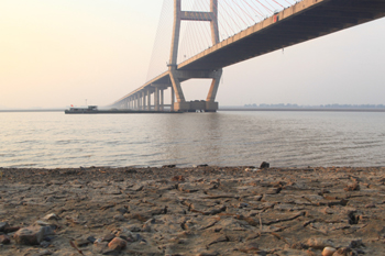 圖為2010年12月10日在江西省湖口縣境內(nèi)的鄱陽(yáng)湖大橋附近岸邊拍攝的已經(jīng)干涸開裂的湖灘。新華社發(fā)(張俊