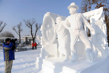 一位記者在拍攝第16屆哈爾濱國(guó)際雪雕比賽獲一等獎(jiǎng)的作品。記者 李勇