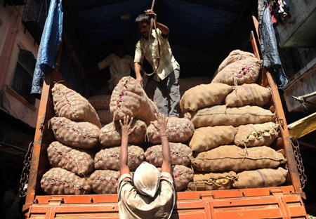印度政府27日公布該國最新的食品價格指數(shù),從今年年初至1月15日以來該指數(shù)上漲了15.57%,意味著正在經(jīng)歷“洋蔥危機”的印度仍在承受巨大的通脹壓力。圖為印度一家菜市場外的工人正在卸貨。