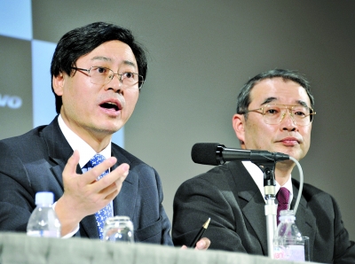 圖為聯(lián)想集團首席執(zhí)行官楊元慶(左)和NEC總裁在當天的新聞發(fā)布會現(xiàn)場。