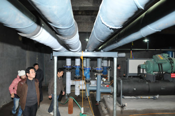 山東日照今冬取暖用上“海水空調(diào)”!昂K照{(diào)”是從海水中提取熱量和冷量,達(dá)到制熱和制冷的目的。如今新能源技術(shù)在山東日照等地已開始推廣使用。圖為來自山東省威海市的房地產(chǎn)技術(shù)人員參觀“海水空調(diào)”的熱交換機(jī)房。新華社發(fā)(李青/攝) |