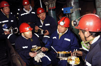 農(nóng)歷大年初一,山西焦煤汾西礦業(yè)集團(tuán)領(lǐng)導(dǎo)走進(jìn)新柳煤礦生產(chǎn)一線,為堅(jiān)守生產(chǎn)崗位的礦工送來(lái)年飯,共進(jìn)午餐。記者 武敵/攝 |