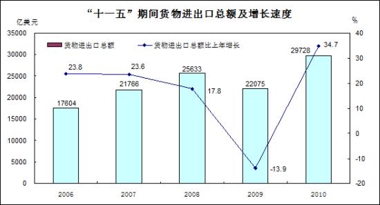 (四)進(jìn)出口商品結(jié)構(gòu)進(jìn)一步優(yōu)化。從出口方面看,2010年,工業(yè)制成品出口占出口總額的比重由“十五”末的93.6%提高到94.8%;機(jī)電產(chǎn)品、高新技術(shù)產(chǎn)品出口占出口總額的比重分別由“十五”末的56.0%和28.6%提高到59.2%和31.2%;“兩高”產(chǎn)品出口得到有效控制,汽車、船舶、飛機(jī)、鐵路裝備、通訊產(chǎn)品等大型機(jī)電產(chǎn)品和成套設(shè)備出口均有新的突破。從進(jìn)口方面看,先進(jìn)技術(shù)、設(shè)備、關(guān)鍵零部件進(jìn)口持續(xù)增長(zhǎng),大宗資源能源產(chǎn)品進(jìn)口規(guī)模不斷擴(kuò)大。2010年,機(jī)電產(chǎn)品、高新技術(shù)產(chǎn)品進(jìn)口分別達(dá)到6603億和4127億美元,分別是“十五”末的1.9倍和2.1倍;非食用原料與礦物燃料、潤(rùn)滑油及有關(guān)原料兩大類商品進(jìn)口占進(jìn)口總額的比重由“十五”末的20.3%提高到28.7%。這不僅滿足了國(guó)內(nèi)經(jīng)濟(jì)發(fā)展的需要,而且對(duì)遭遇金融危機(jī)的全球經(jīng)濟(jì)回穩(wěn)和復(fù)蘇做出了巨大貢獻(xiàn)。