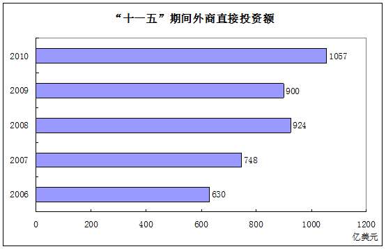 (一)利用外資規(guī)模躍居全球第二位!笆晃濉逼陂g,我國(guó)外商直接投資累計(jì)達(dá)到4260億美元,年均增長(zhǎng)11.9%,是“十五”期間的1.6倍,全球排名由“十五”末的第四位上升至第二位,并連續(xù)18年位居發(fā)展中國(guó)家首位。2007年外商直接投資突破700億美元,2008年直接跨上900億美元臺(tái)階。即使是在國(guó)際金融危機(jī)沖擊較為嚴(yán)重的2009年,外商直接投資仍然超過900億美元,降幅遠(yuǎn)遠(yuǎn)低于全球平均水平。2010年,外商直接投資突破1000億美元,達(dá)到1057億美元,是“十五”末的1.8倍。