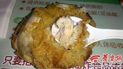 廣告很誘人,但消費卻讓人失望,說不出是什么味,但能肯定絕對不是蟹肉! 隨后記者購買了一只”黃金蟹斗”,聞起來也是一股刺鼻的味道,吃在嘴里感覺是魚肉蟹肉淀粉混合體,口感一般,但也并未發(fā)現有魚骨魚刺。