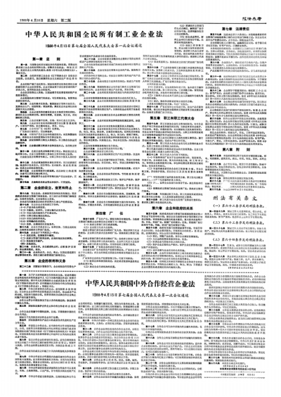 1988年4月16日《經(jīng)濟(jì)參考報(bào)》第二版全文刊登了在七屆全國人大一次會議上通過的《中華人民共和國全民所有制工業(yè)企業(yè)法》(下稱“企業(yè)法”)和《中華人民共和國中外合作經(jīng)營企業(yè)法》。這兩部法律的頒布順應(yīng)了當(dāng)時(shí)的經(jīng)濟(jì)社會環(huán)境,其中企業(yè)法的頒布更是以法律形式確立了國企改革的階段性成果,在國企改革的初級階段起到了很大的推動作用。