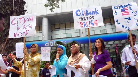 圖為抗議活動(dòng)現(xiàn)場上,雇員拿標(biāo)語抗議。 3月9日,當(dāng)天在吉隆坡的一家美資銀行外頭,約有100名的馬來西亞全國銀行職工會(huì)(NATIONAL UNION OF BANK EMPLOYEES)帶領(lǐng)該銀行的雇員舉行示威抗議活動(dòng)以抗議該銀行的執(zhí)行長剝削雇員福利。