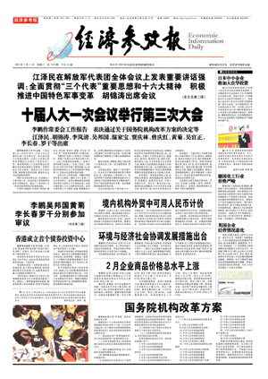 2003年3月11日《經(jīng)濟(jì)參考報》頭版刊登了《國務(wù)院機(jī)構(gòu)改革方案》,見證了第五次政府機(jī)構(gòu)改革。