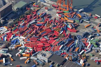 3月12日在日本仙臺港口上空拍攝的地震后散落的集裝箱。新華社/美聯(lián) |