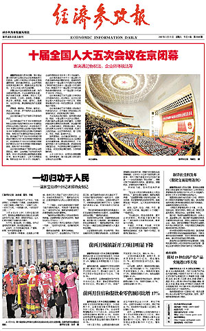 2007年3月17日《經(jīng)濟(jì)參考報(bào)》頭版頭條刊登了十屆全國人大五次會議閉幕的消息,突出報(bào)道了大會通過《物權(quán)法》和《企業(yè)所得稅法》。而事實(shí)上,本報(bào)在16日就已對兩部法律的修改情況做了大篇幅的報(bào)道。