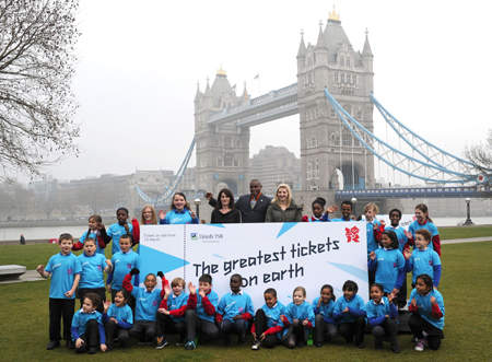 3月15日,在倫敦波特菲爾德公園內(nèi),前羅馬尼亞體操運動員科馬內(nèi)奇(后排左五)、美國田徑運動員卡爾?劉易斯(后排左六)和英國游泳運動員阿德林頓(后排左七)與代表倫敦奧運會26個比賽項目的小學生,簇擁著一張巨型門票合影。當日,2012年倫敦奧運會門票正式開售!