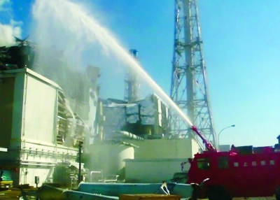 圖為日本自衛(wèi)隊繼續(xù)為福島核電站3號機組注水。