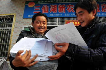 湖南益陽(yáng)南縣三仙湖鎮(zhèn)新聯(lián)村種糧大戶彭志才(左)與別人合伙,將全村1950畝土地全部流轉(zhuǎn)到了自己手上。拿著今年上百份土地流轉(zhuǎn)合同,彭志才很是高興,但他同時(shí)也為日益增加的成本而犯愁。記者