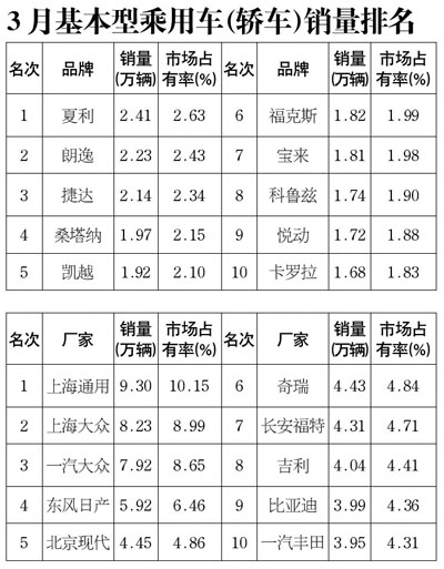 3月,銷量排名前十位的轎車生產(chǎn)企業(yè)共銷售56.54萬輛,占轎車銷售總量的62%。與上月比較,上海通用、上海大眾、一汽大眾繼續(xù)保持前三甲不變,排名上升的有:奇瑞上升三位,東風(fēng)日產(chǎn)上升一位;排名下降的有:吉利下降兩位,北京現(xiàn)代、比亞迪下降一位;一汽豐田新進(jìn)前十,神龍跌出前十。
