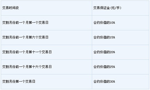 說明:我所按現(xiàn)有品種的保證金體系,對臨近交割月的焦炭期貨合約保證金進(jìn)行梯度設(shè)計(jì),即:焦炭期貨合約進(jìn)入交割月份前一個(gè)月的第一個(gè)交易日起,交易所以每5個(gè)交易日為一個(gè)梯度,逐步提高該合約的交易保證金標(biāo)準(zhǔn);焦炭期貨合約進(jìn)入交割月份后,合約交易保證金提高至合約價(jià)值的30%,用以抵償客戶或會員可能因交割違約而須支付的5%違約金、以及在征購、競賣中可能發(fā)生的溢、折價(jià)損失(見表6)。